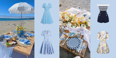 Besides seaside activities, you may also want to take a good rest and get away from the heavy work. Well, short skirts and rompers are the excellent choices for a late morning brunch or a relaxing afternoon at the beach. For example, take a walk by the sea, feel the gentle sea breeze and soak up the sun in a sky blue 1950s Polka Dots Bow Swing Dress or 1950s Plaid Belt Swing Dress. You can also enjoy a beach picnic with friends and family in a Red Bodysuit & Denim Blue Buttons Shorts or Navy Blue Patchwork Off-shoulder Striped Romper. Besides, you can even go shopping at the beach store with your friends in a loose and comfortable Yellow Floral Swing Romper which will make you be complimented by the people you meet.