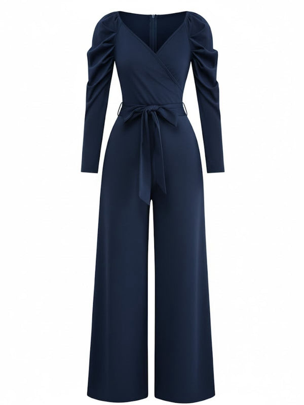1930s Solid Ruched V-Neck Belted Jumpsuit | Retro Stage