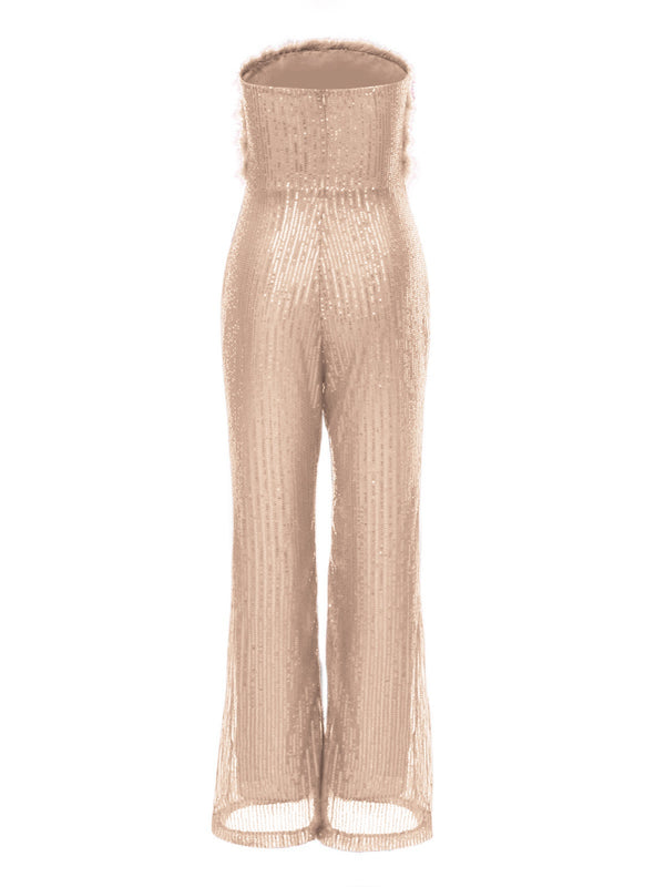 1950s Solid Feather Sequin Patchwork Strapless Jumpsuit