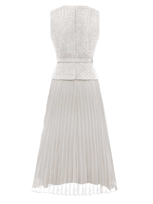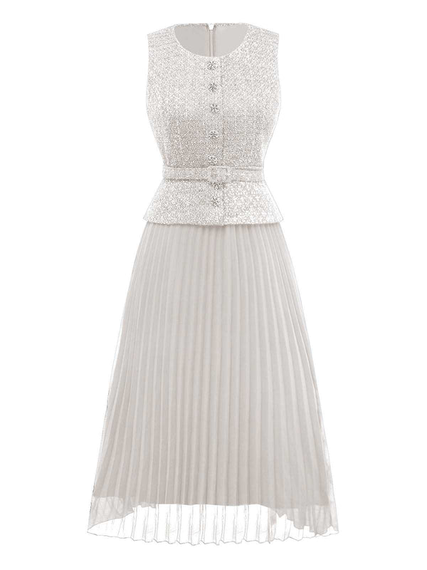 1960s Pearl Button Belted Sleeveless Pleated Dress