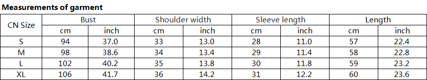 Size: There are 4 sizes (S/M/L/XL) available. Please allow 1-inch differences due to manual measurement. Thanks for understanding! (All measurements in cm and please note 1 inch=2.54cm)