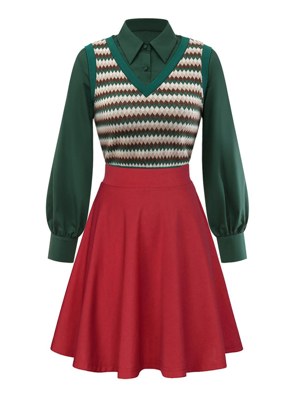 [Pre-Sale] 2PCS Green 1960s Diamond Check Knitted Vest Blouse & Skirt | Retro Stage