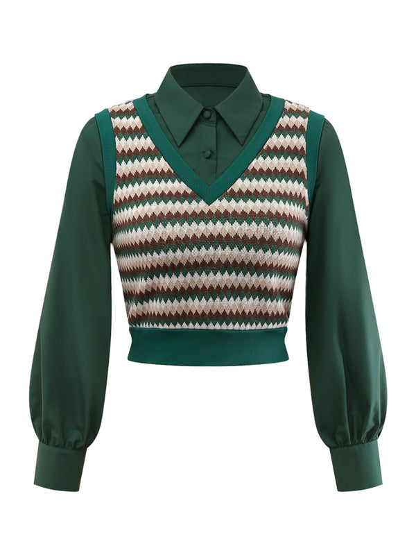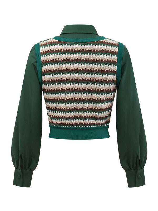[Pre-Sale] 2PCS Green 1960s Diamond Check Knitted Vest Blouse & Skirt