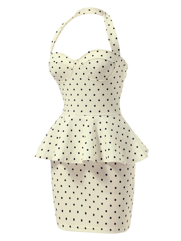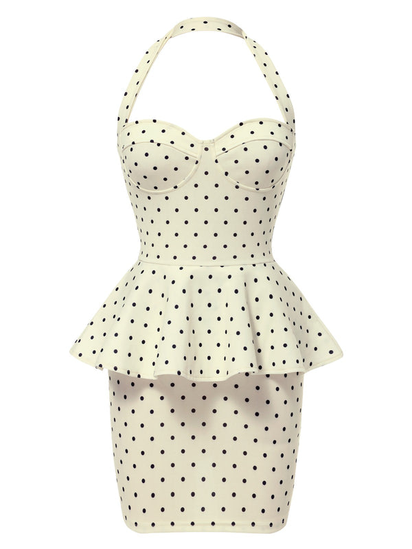 [Pre-Sale] Beige 1960s Polka Dot Halter Ruffle Pencil Dress