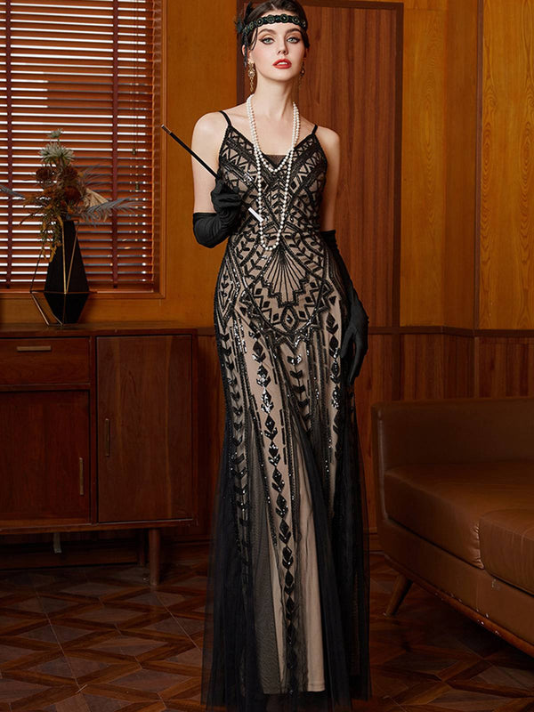 Black 1920s Gatsby Sequin Mesh Maxi Evening Dress