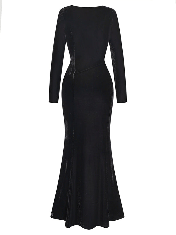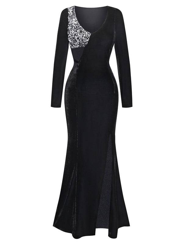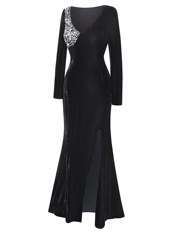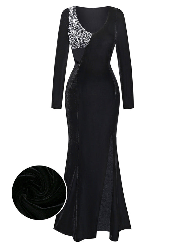 [Pre-Sale] Black 1930s Sequined Velvet Cutout Slit Fishtail Dress