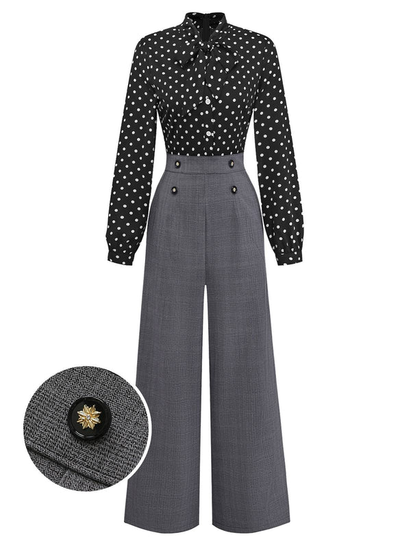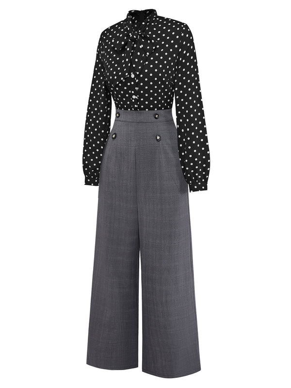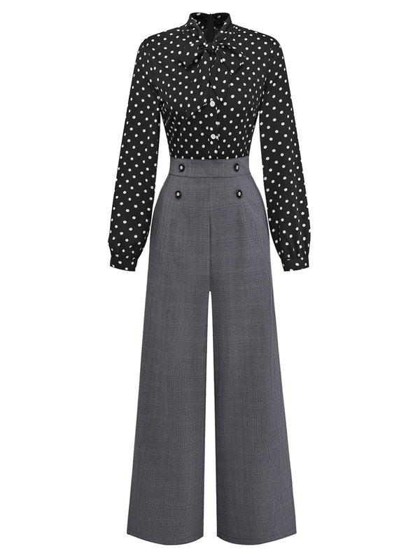 [Pre-Sale] Black 1950s Polka Dot Patchwork Tie Neck Jumpsuit