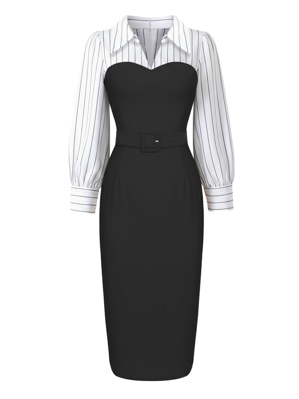 [Pre-Sale] Black 1960s Pinstripe Patchwork Lapel Bodycon Dress | Retro Stage