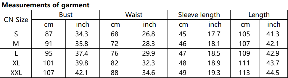 Note: The Measurements of the garment charts may vary due to different products or suppliers.