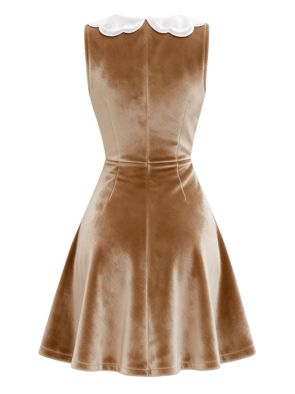 Sugar-sweet 1960s Christmas style bakes into every detail of this Retro Stage gingerbread dress, perfect for vintage lovers who adore gingerbread-themed looks. Soft cookie-brown velvet is cut into a cute A-line mini silhouette that skims the waist and flares gently over the hips, topped with a crisp white Peter Pan collar for that doll-like ’60s charm. Down the front, candy-cane trims and peppermint-swirled buttons mimic iced cookie decorations, while handy patch pockets are edged with the same festive detailing. Slip into this gingerbread 1960s Christmas dress with tights, Mary Janes and a red lip for baking days, parties or cosy family photos, and you’ll look like the sweetest retro treat of the season.
