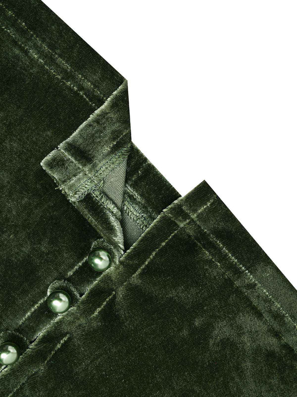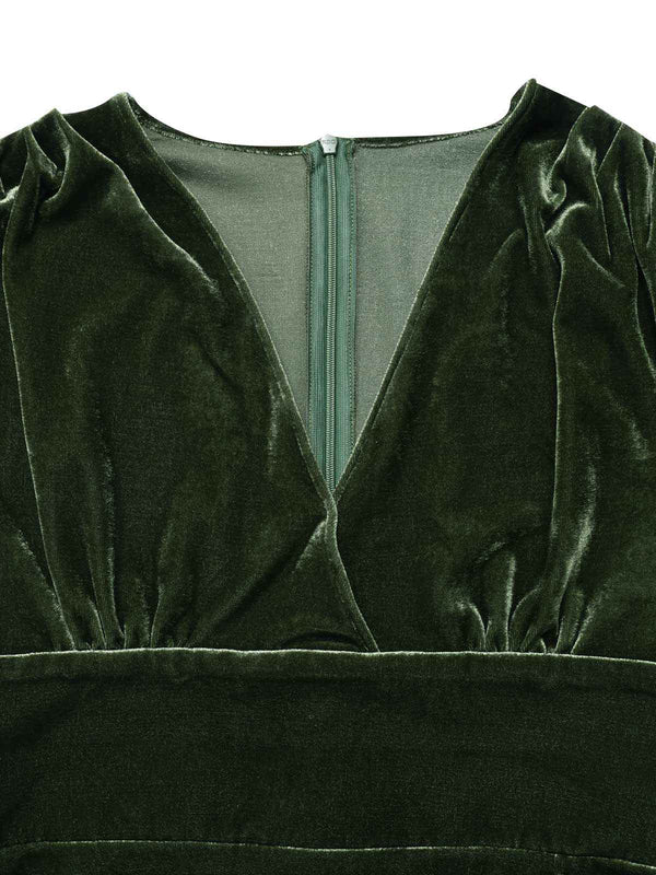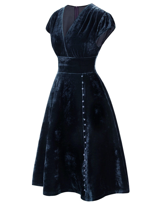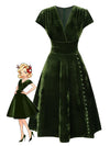 Lush forest-green velvet gives this Retro Stage retro dress a rich, enchanted-forest vibe, ideal for anyone curating a vintage fashion wardrobe. The bodice features a deep V-neckline and gently capped sleeves, with a wide waistband that defines the waist and shapes a flattering hourglass silhouette. Below, the skirt flares softly to a twirling A-line, its smooth panels catching the light with every movement, while a row of covered buttons along the side adds a subtle, tailored touch. Envision yourself at an elegant holiday dinner or New Yearโs toast, candlelight reflecting off the velvety green as you glide through the room in quietly luxurious Retro Stage style.