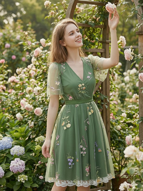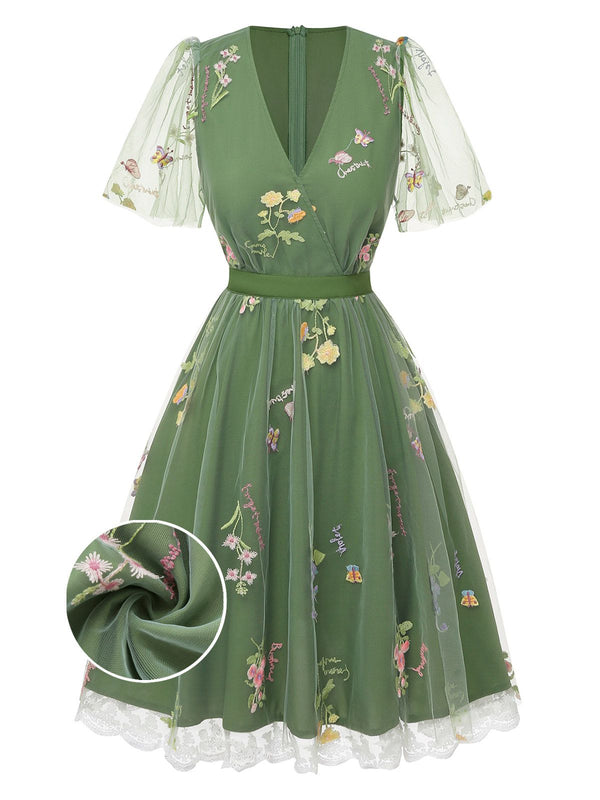 [Pre-Sale] Green 1950s Floral Puff Sleeve Mesh Embroidered Dress