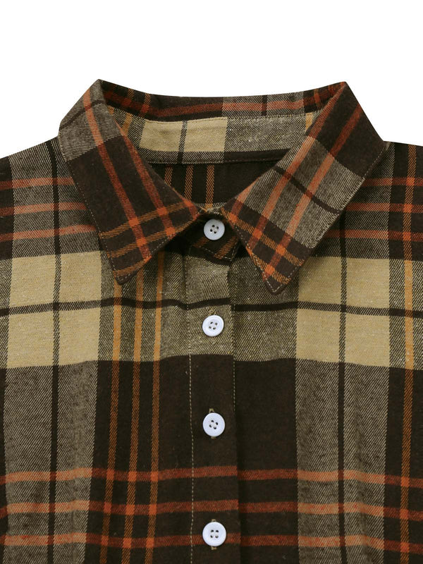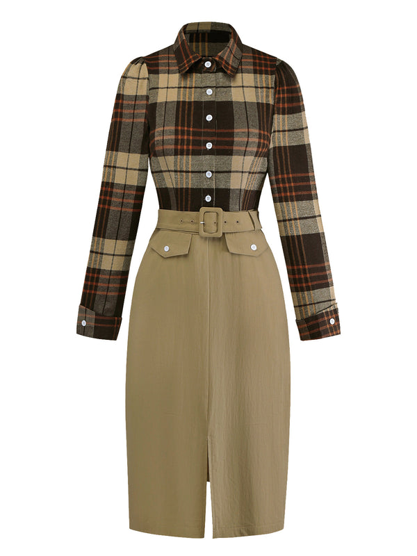 [Pre-Sale] Khaki 1940s Shirt Collar Plaid Belted Dress