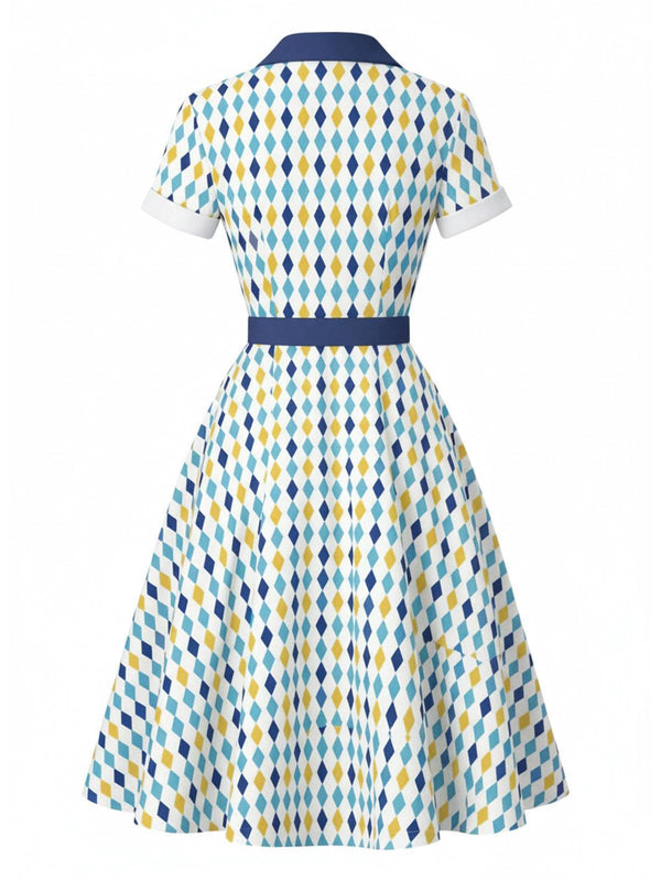 [Pre-Sale] Multicolor 1950s Argyle Bow Collar Belted Dress | Retro Stage