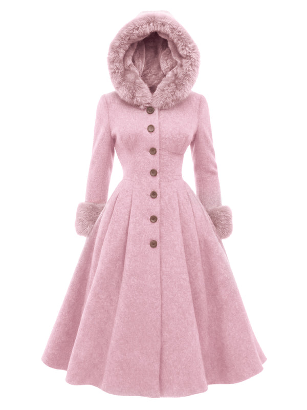 Snowy sidewalks suddenly feel like a vintage movie set in this Retro Stage 1950s coat, perfect for retro lovers who want warmth with a little fairy-tale drama. Rich cocoa-brown fabric is tailored into a nipped-in bodice and full swing hem, so you keep that classic hourglass shape even bundled up against the cold. A lavish faux-fur–trimmed hood frames your face like a soft halo, with matching furry cuffs and a row of covered buttons marching neatly down the front for that polished mid-century finish. Layer this 1950s coat over your favourite dresses with gloves and heeled boots, and you’ll look like the cosiest, most elegant heroine on every winter stroll.