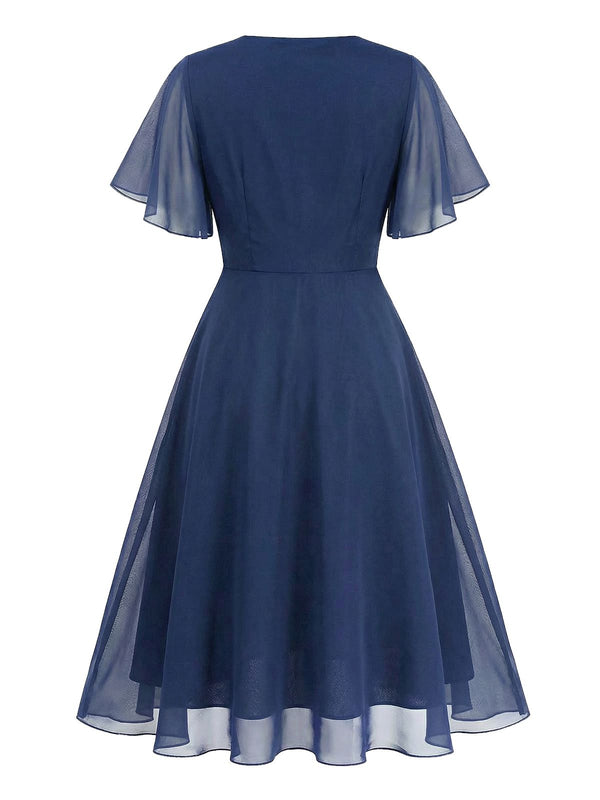 [Pre-Sale] [Plus Size] Navy Blue 1940S Wrap V-neck Short-Sleeve Brooch Chiffon Dress