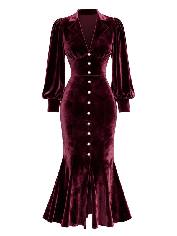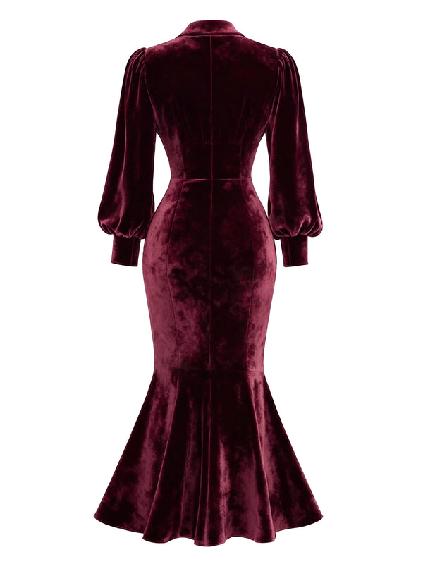 [Pre-Sale] Red 1930s Velvet Pearl Lantern Sleeve Mermaid Dress