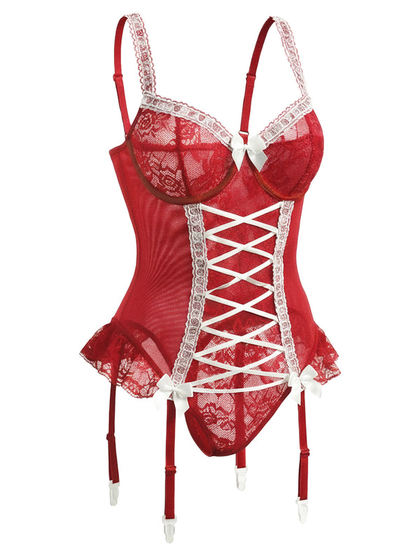 Red 1960s Lace Bow Corset Lingerie With Stocking