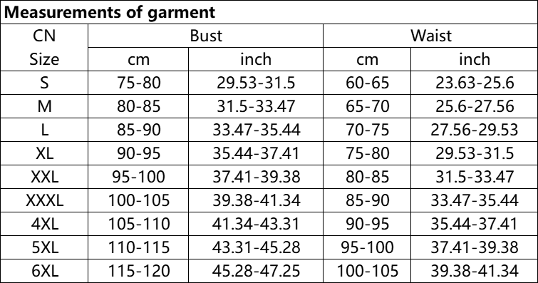 Size: There are 9 sizes (S/M/L/XL/XXL/XXXL/4XL/5XL/6XL) available. Please allow 1-2cm differences due to manual measurement. Thanks for understanding! (All measurements in cm and please note 1cm=0.39inch)