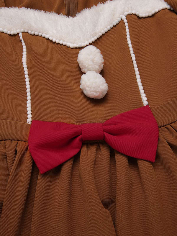 This charming Retro Stage gingerbread dress turns you into a life-size gingerbread cookie, crafted in warm cookie-brown fabric with a sweetheart-style neckline edged in soft white “icing.” The fitted bodice is decorated with fluffy pom-pom “buttons” and finished with a bold red bow at the waist, while puff sleeves tied with mismatched red and black ribbons add playful detail inspired by classic vintage fashion. A full, flared skirt swirls around the knees, trimmed with bands of creamy white and cozy faux-fur, dotted with smiling gingerbread man appliqués marching along the hem. Imagine twirling through a cozy Christmas gathering, fairy lights glowing and the scent of cinnamon in the air, as this sweet and whimsical Retro Stage vintage christmas dresses makes you the cutest treat at the party.Stretch: Slight Stretch