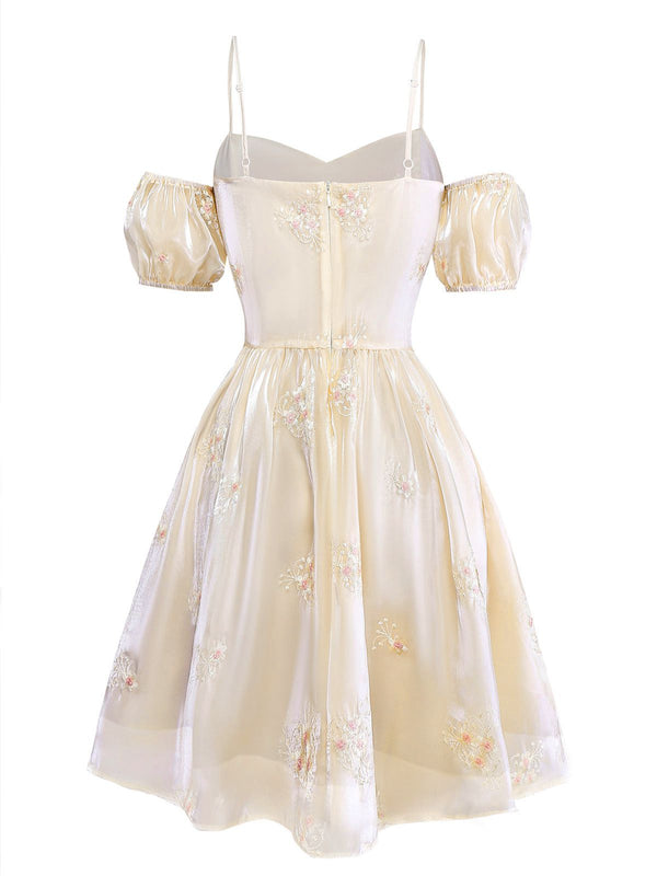 [Pre-Sale] White 1950s Embroidered Puff Sleeve Organza Dress